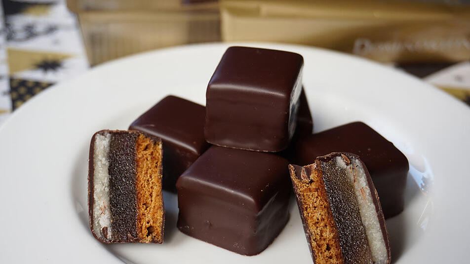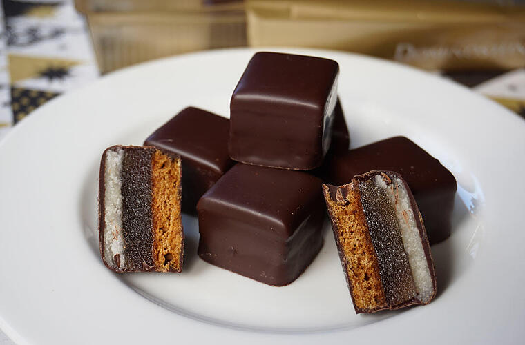 - Die Platte in Quadrate schneiden und einzeln in die geschmolzene Kuvertüre eintauchen, abklopfen, und auf Backpapier setzen. Für diesen Schritt am besten eine Pralinengabel nehmen. Nach Belieben mit Streusel verzieren oder die Kuvertüre ohne Dekor fest werden lassen.