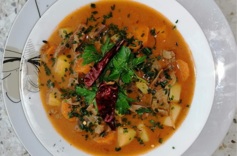 - Die in Stücke geschnittenen Kutteln, die gewürfelten Kartoffeln und die Möhren aus der Brühe in die Paprikasauce geben. Nochmals kurz köcheln lassen, damit sich die Aromen verbinden.