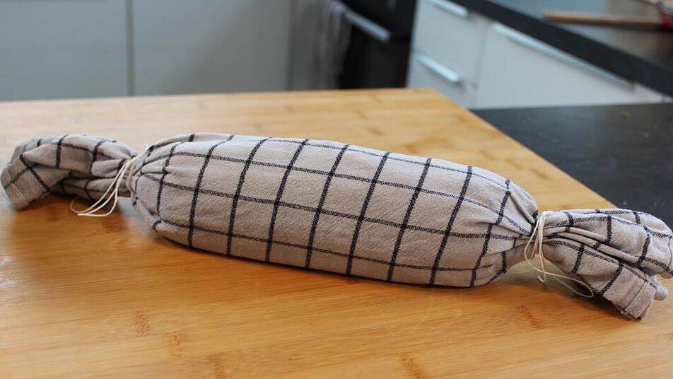 Dann nehmen wir eine Geschirrhandtuch her, machen dieses nass und wringen es gut aus. Auf dem feuchten Handtuch verteilen wir dann die rohe Klossmasse und formen sie zu einer Rolle. Die Enden drehen wir fest ein und fixieren sie mit Küchengarn.