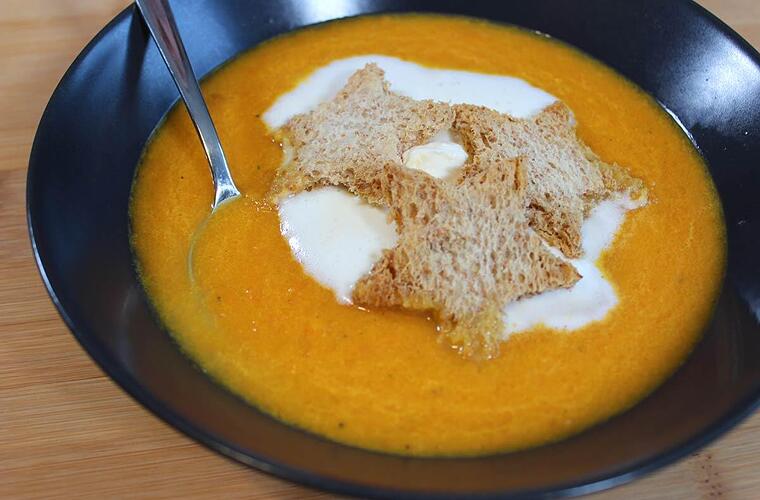 - Die Suppe nun auf 4 Teller anrichten, einen Esslöffel Sahne auf jedem Teller verteilen und 2 Toaststerne auf jeden Teller legen.