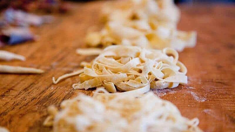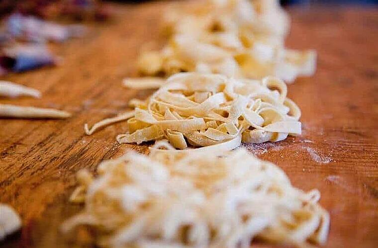 - Den Teig in drei gleich große Teile teilen. Nun den Teig mit der Nudelmaschine zu dünnen Platten pressen und anschließend in Streifen schneiden. Alternativ könnt ihr natürlich auch ein Nudelholz verwenden und den Teig auf einer Arbeitsfläche ausrollen. Diesen anschließend ebenfalls in feine Streifen schneiden.