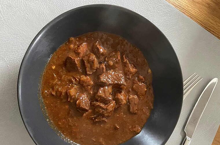 Bei meinem klassischen Rinder-Gulasch handelt es sich zwar nicht um ein typisch fränkisches Gericht, aber eines was im Frankenland dennoch gerne gegessen wird. Das Besondere an diesem Gulasch ist, dass es zu gleichen Teilen aus Fleisch und Zwiebeln besteht und durch das lange Köcheln das Fleisch am Ende so lecker und butterweich ist, dass es fast zerfällt. Gut passen dazu Nudeln oder frische Brötchen.