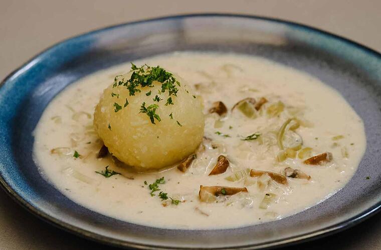 Kloß mit Soß' - eines meiner Lieblingsessen. Als Vegetarierin auch eine beliebte Alternative am Sonntag. Damit das nicht langweilig wird, werden regelmäßig neue Soßen ausprobiert. Heute: eine cremige Pilz-Lauch-Soße.