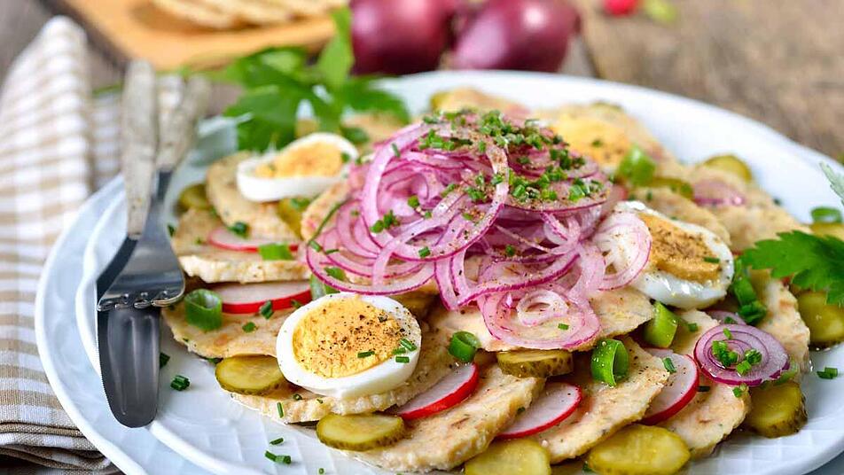 - Die Zwiebel schälen und in Ringe schneiden. Die Radieschen putzen, waschen und in Scheiben schneiden. Die Eier und Essiggurken ebenfalls in feine Scheiben schneiden. Den Schnittlauch in Röllchen schneiden.