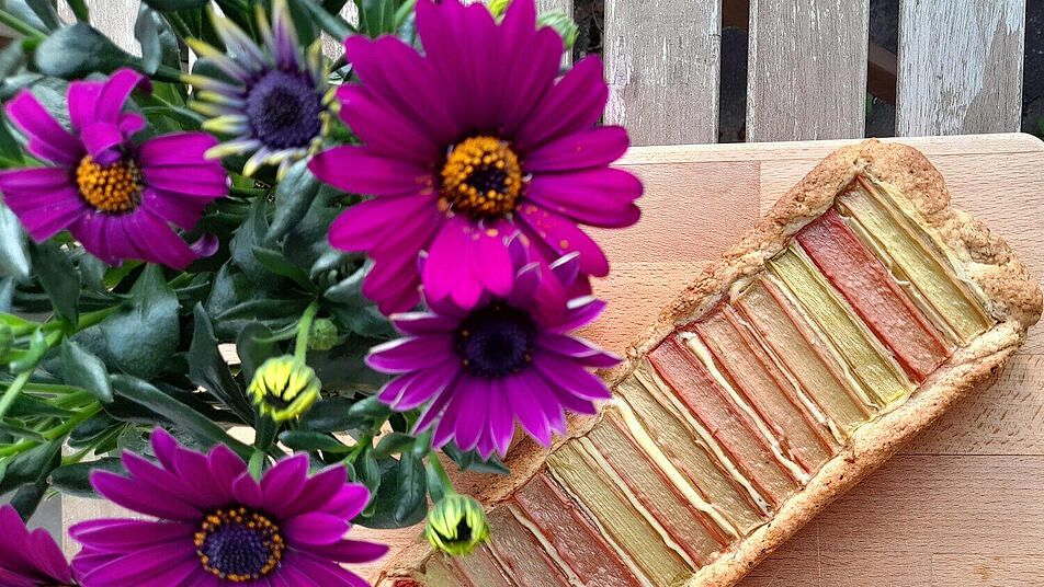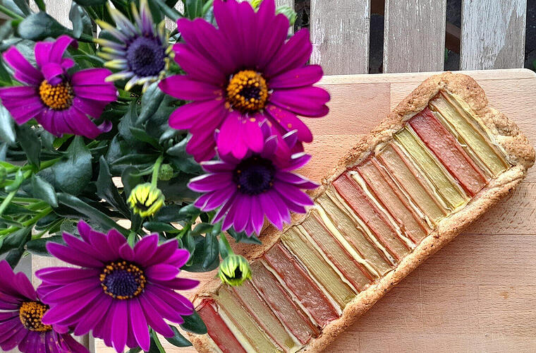 - Mit den Rhabarberstücken belegen, sodass ein Querstreifen Muster entsteht.