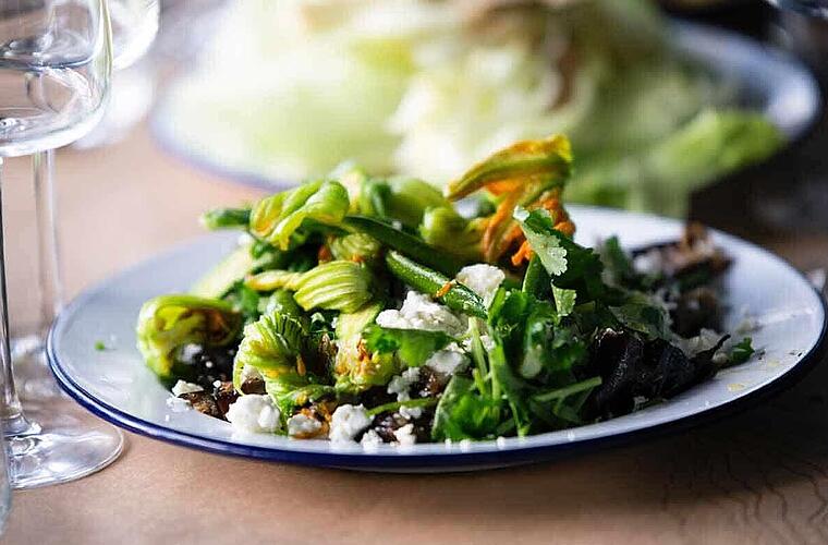 - Die Zucchini mit Küchenkrepp gut abreiben, auf mittelfeinen Hobel zum Kraut raffeln. Schinken, Zwiebeln, Minze dazugeben, etwas Balsamico anmarinieren, gut vermengen, etwas einziehen lassen, danach Käsedressing unterheben.