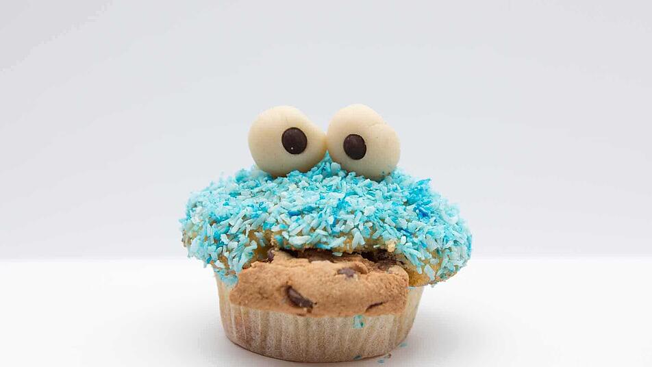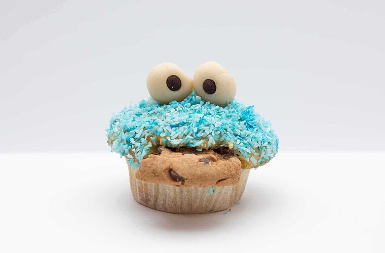 - Wenn der gewünschte Farbton erreicht ist, die Masse Portion für Portion in die Kartoffelpresse geben und auf die abgekühlten Muffins pressen. Die Cupcakes mit halbierten Keksen und Augen verzieren.