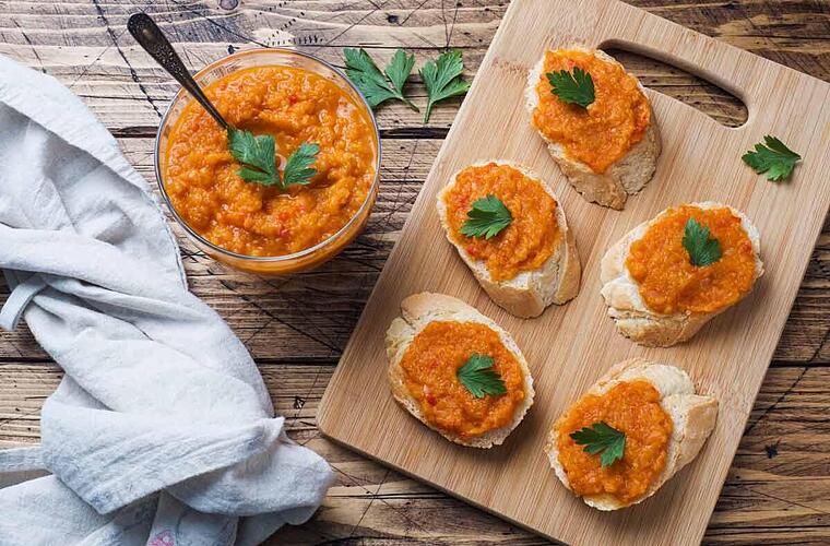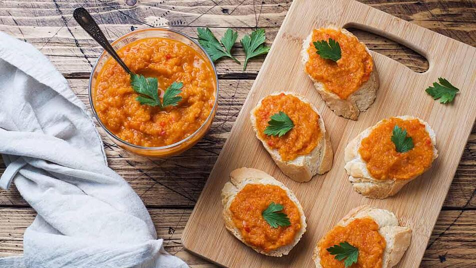 - Den Kürbis und die Karotten aus dem Ofen nehmen und in eine hohe Schüssel geben. Die Zwiebeln und den Knoblauch dazugeben. Auch die Tomaten und die gerösteten Kürbiskerne untermischen. Mit einem Pürierstab alles cremig pürieren. Wenn die Masse zu fest ist, etwas Wasser oder Öl dazugeben. Zum Schluss mit Salz & Pfeffer und den Chilliflocken abschmecken.