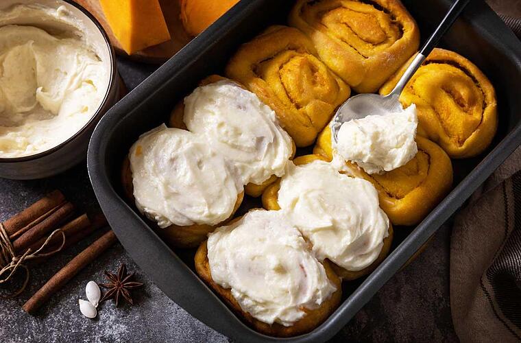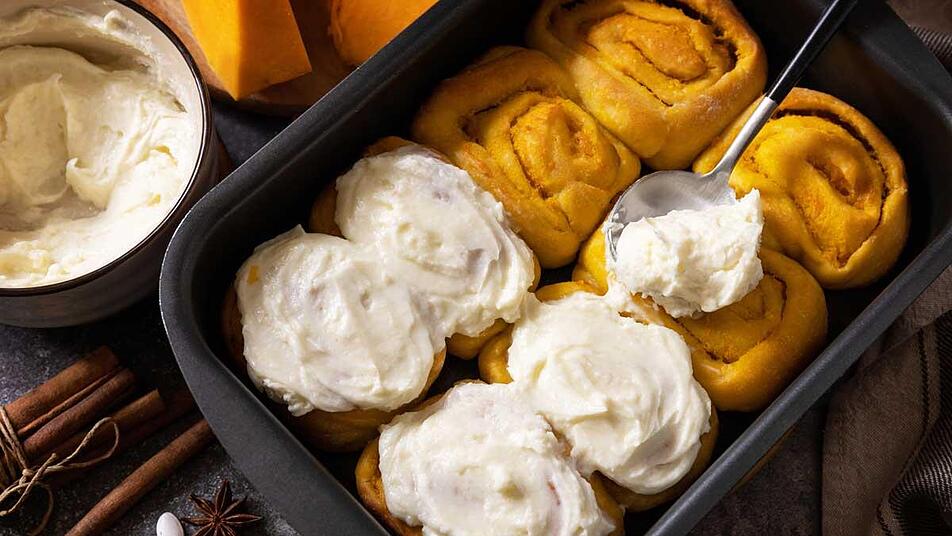 - Die Schnecken nach 30 Minuten in den Ofen geben und für circa 25-30 Minuten goldbraun backen lassen. Nach der Backzeit etwas abkühlen lassen und mit dem Frosting bestreichen.