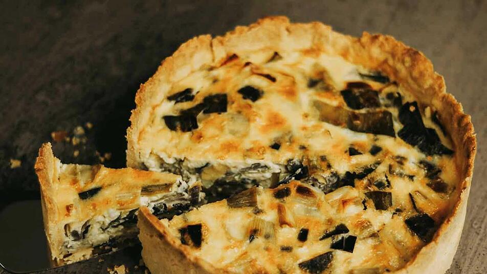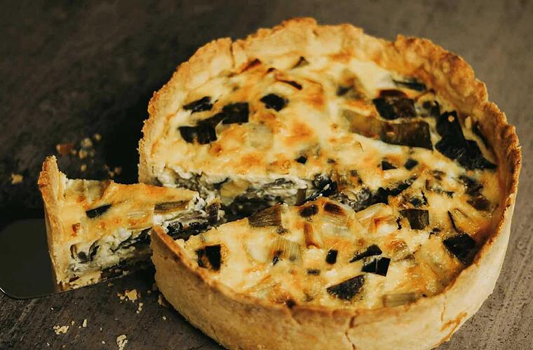 - Mürbeteigboden aus dem Ofen nehmen, Hülsenfrüchte und Backpapier vorsichtig entfernen. Gedünsteten Lauch gleichmäßig auf dem Mürbteigboden verteilen. Sahne-Ei-Guss darübergießen und den Kuchen weitere 35 bis 40 Minuten backen. Ca. 10 Minuten abkühlen lassen, dann in Stücke schneiden und servieren.