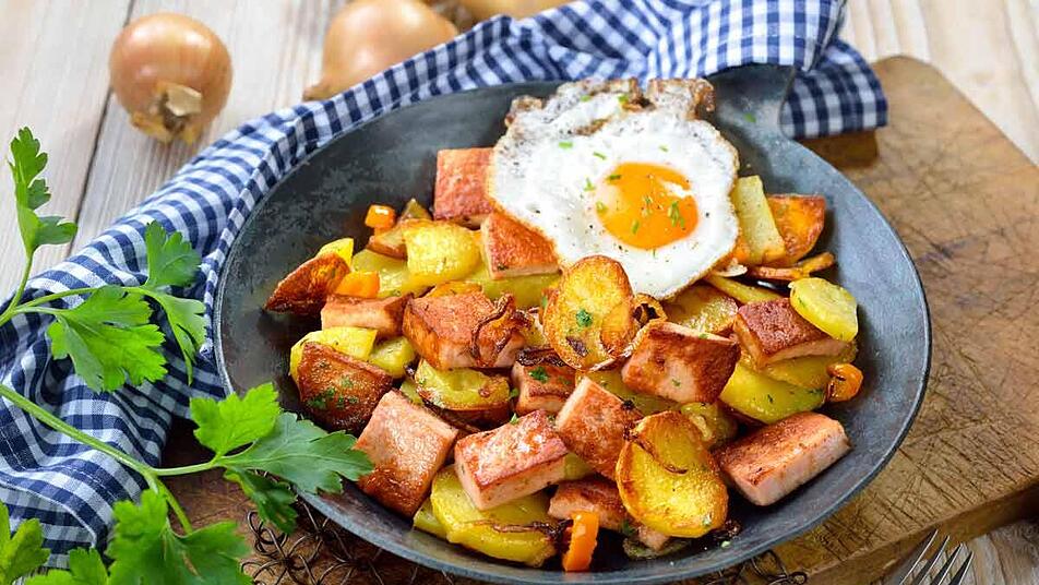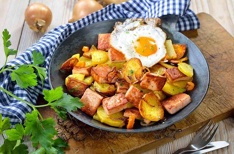 - Dann die Zwiebeln und Kartoffeln aus der Pfanne nehmen. Den Leberkäse zuerst in Scheiben schneiden, dann würfeln und in der Pfanne von allen Seiten anbraten. Gleichzeitig in einer weiteren Pfanne die Spiegeleier für ca. 4 Minuten auf mittlerer Hitze braten. Mit Salz und Pfeffer würzen.