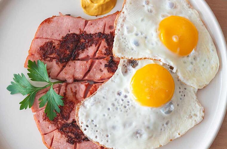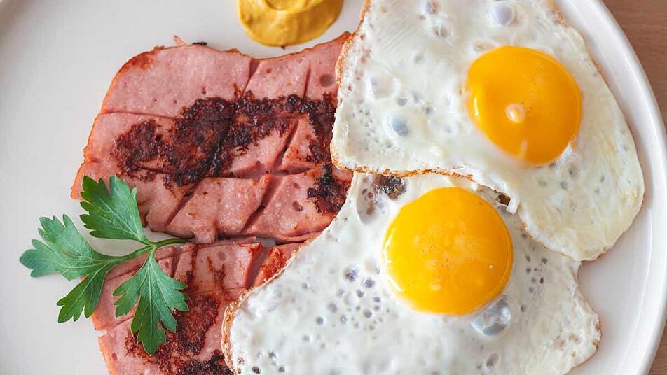 - Die Eier aufschlagen und vorsichtig in die Pfanne geben. Bei mittlerer Hitze 3-4 Minuten braten und mit Salz und Pfeffer würzen. Das Spiegelei auf dem Leberkäse mit Senf servieren.