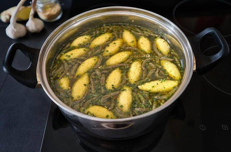 - Den Teig ca. 20 Minuten quellen lassen. Anschließend mit zwei feuchten Löffeln Nockerl formen und in gesalzenes, kochendes Wasser geben. Kurz aufkochen lassen, dann die Hitze reduzieren und weitere 10 bis 15 Minuten ziehen lassen.