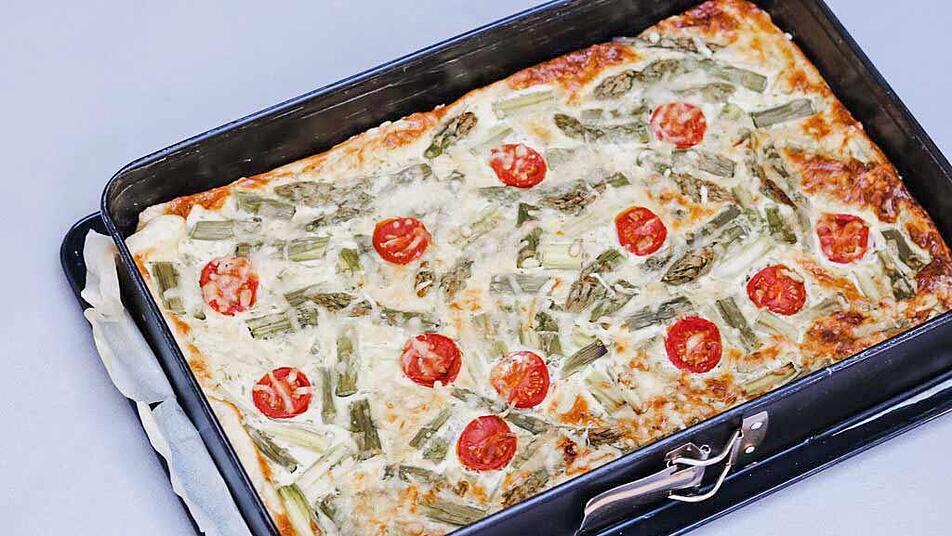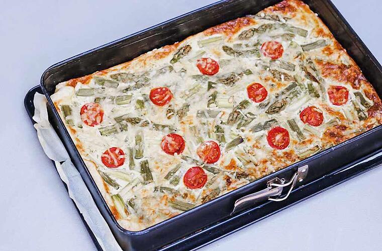 - Den Spargel waschen, den Stunk abschneiden und zur Hälfte schälen. Anschließend in Stücke schneiden. Die Tomaten waschen und halbieren und beides auf dem Blätterteig verteilen.