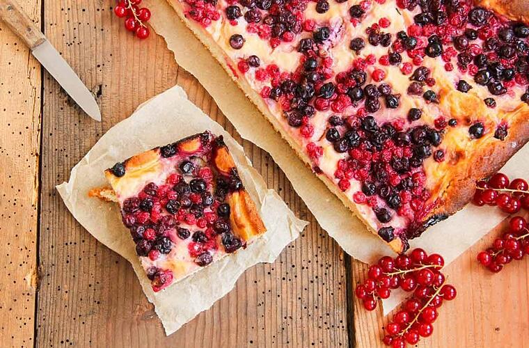 Wer es beim Backen gern unkompliziert mag und trotzdem einen echten Hingucker auf dem Tisch haben will, dann ist unser Johannisbeer-Kuchen vom Blech genau das Richtige. Der Boden schön locker, obendrauf eine cremige Schicht - nicht zu süß - und dazu die leicht säuerlichen Johannisbeeren, die dem Ganzen einen frischen Kick geben. Wer mag, kann anstatt Johannisbeeren Kirschen, Erdbeeren oder Heidelbeeren verwenden.