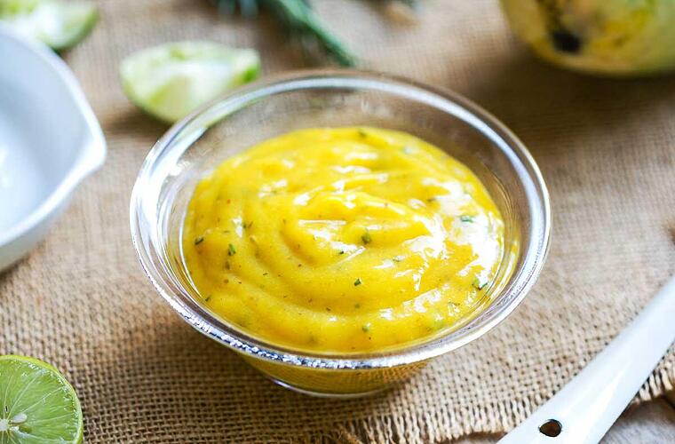 - Essig, Öl, Saft der Zitrone und Senf mischen, zu der Mango geben und alles pürieren.