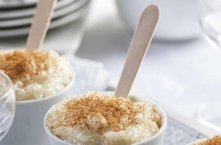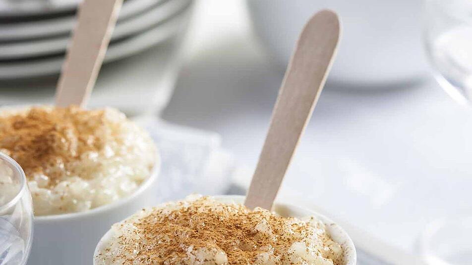 - Den Milchreis erkalten lassen und die Orangen- und Zitronenschalen entfernen, den Reis in breite Gläser abfüllen