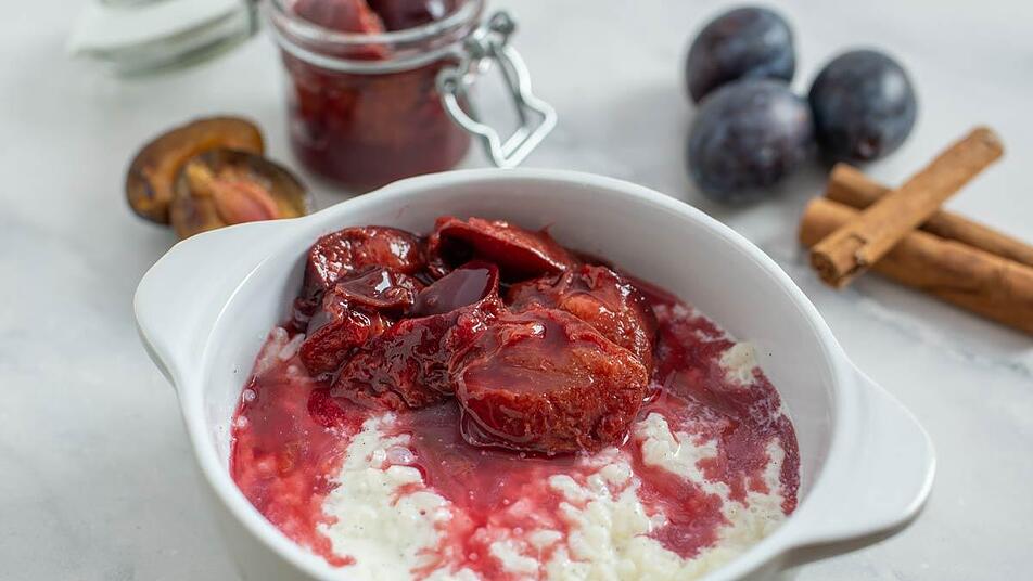 - Währenddessen die Zwetschgen waschen, halbieren und die Kerne entfernen. Die Zwetschgenhälften dann mit Rotwein, Anis und 3 El Zucker in einen Topf geben und für 8-10 Minuten zugedeckt dünsten lassen. Zusammen mit dem Milchreis servieren.