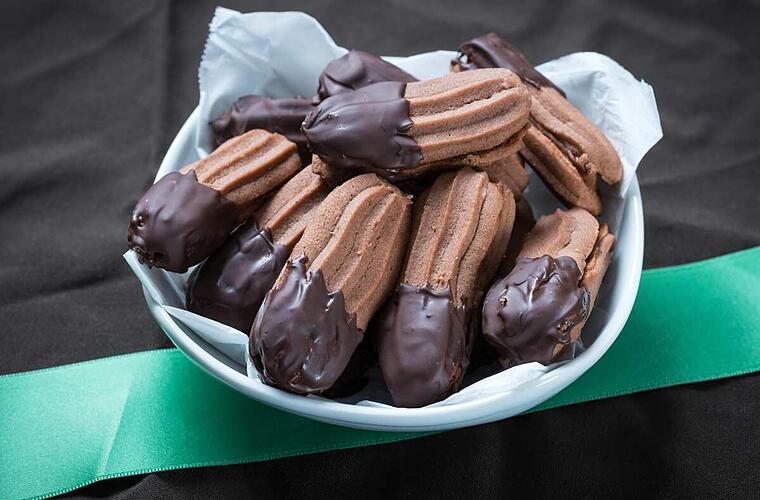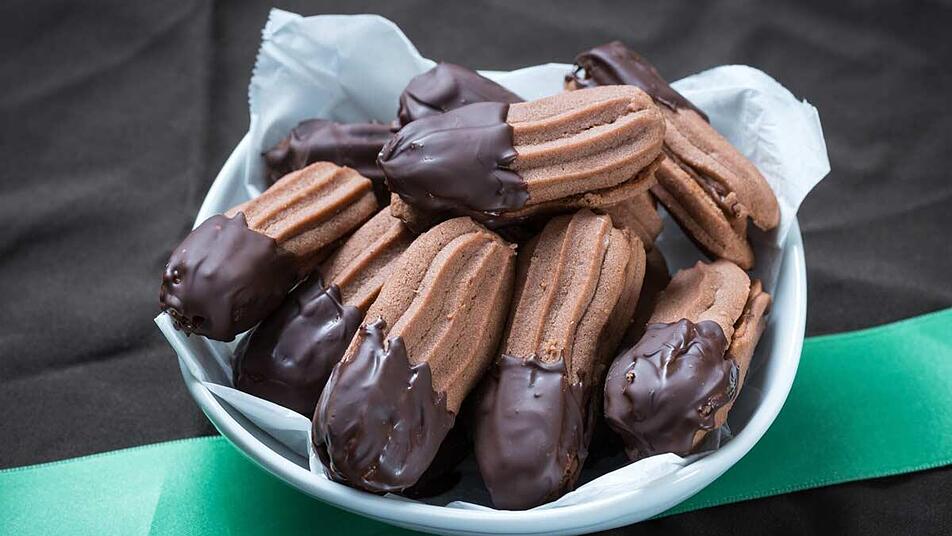 - Zuletzt tauchst du noch ein Ende des Spritzgebäcks in die Kuvertüre und lässt dann alles abkühlen.