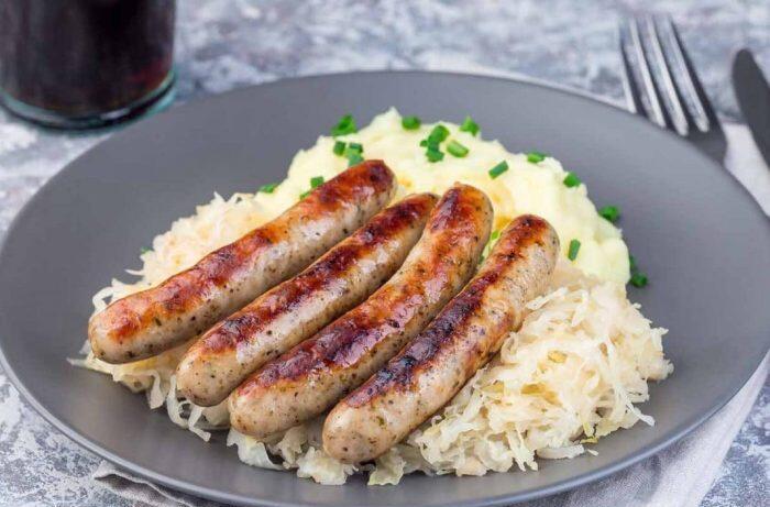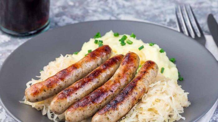 - Einen Esslöffel Butterschmalz in einer Pfanne erhitzen. Die Würstchen rundherum goldbraun anbraten. Kartoffeln abgießen, Milch und Butter hinzugeben und alles zu einem Püree stampfen. Mit Salz und Muskat würzen. Sauerkraut ebenfalls abschmecken.