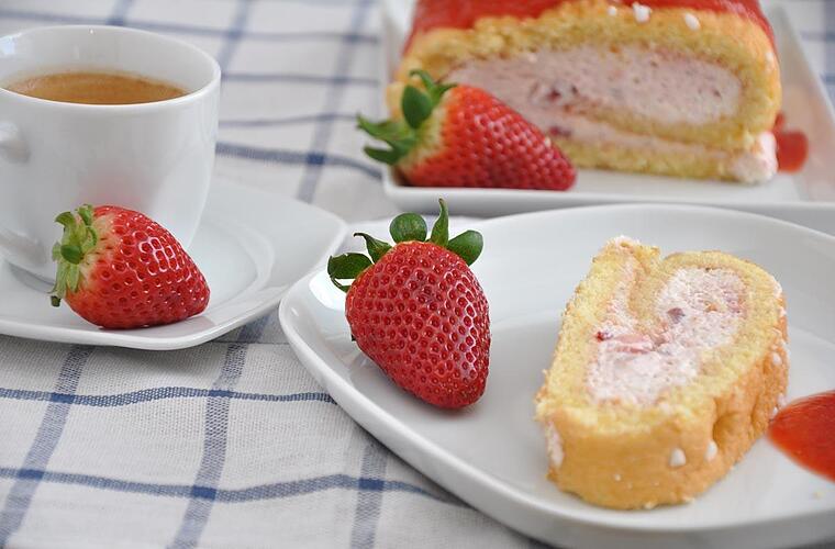 - Jetzt wird die Rolle befüllt: Dafür rollt man die Biskuitplatte auf und verteilt die Creme darauf. Oben einen Rand von ca. 3 cm frei lassen. Die Erdbeerstückchen auf der Creme verteilen und die Rolle mit Hilfe eines Geschirrtuchs vorsichtig einrollen.