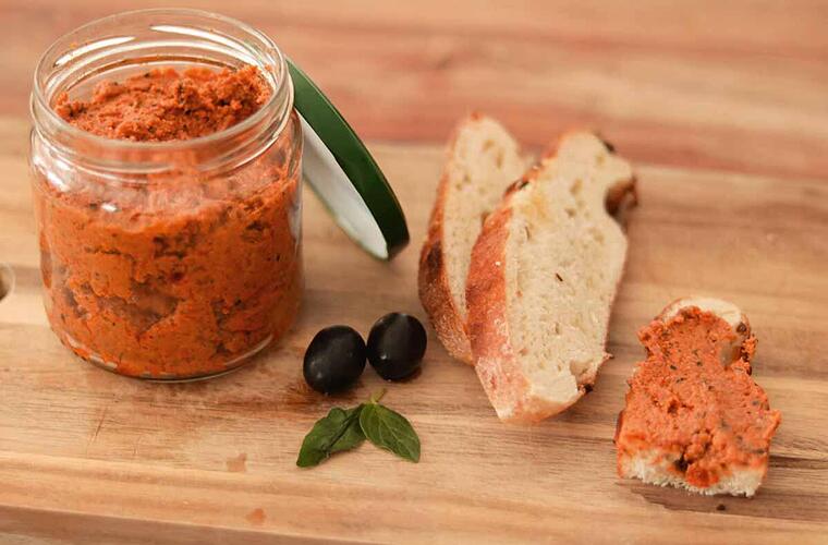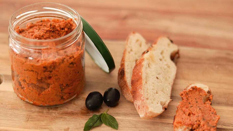 - Alle Zutaten zu den Tomaten geben und zu einem feinen Pesto pürieren. Zuletzt noch mit Salz, Pfeffer und evtl. Chili würzen und abschmecken.