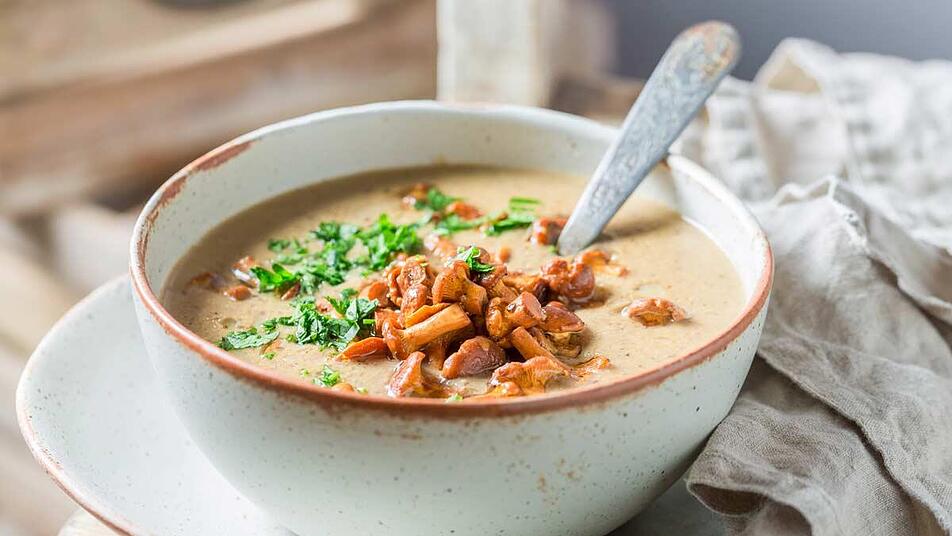 - Die Suppe noch einmal aufkochen lassen und mit Salz und Pfeffer abschmecken. Die Pfifferling-Rahm-Suppe auf einem Teller mit frischer Petersilie, den angebratenen Pilzen und dem Schinken anrichten.