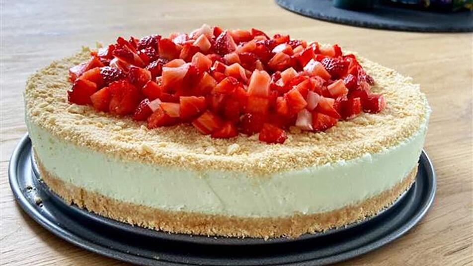 - Vor dem Servieren die Beeren waschen und schneiden. Die Torte aus dem Kühlschrank holen und mit den übrigen Biskuit-Bröseln, sowie den Beeren dekorieren und servieren.