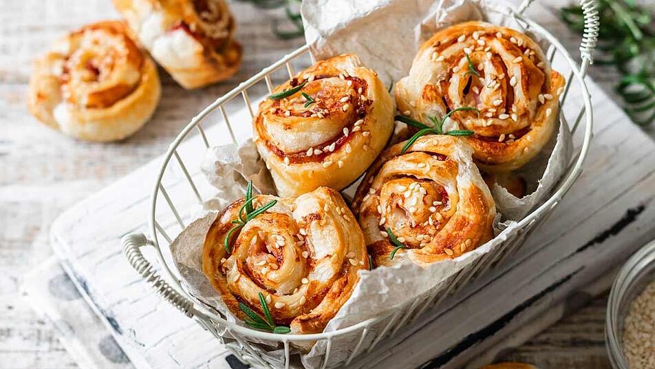 - Mithilfe des Pizzaschneiders den Blätterteig in dünne Streifen schneiden. Diese dann aufrollen, sodass kleine Schnecken entstehen.