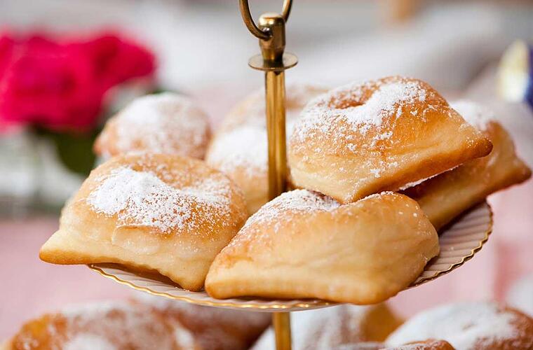 - In der Zwischenzeit erhitzt man das Fett in einem geeigneten Topf. Wenn es heiß ist, lässt man ein Teigstück hinein und übergießt es mit einem Schöpfer voll Fett.