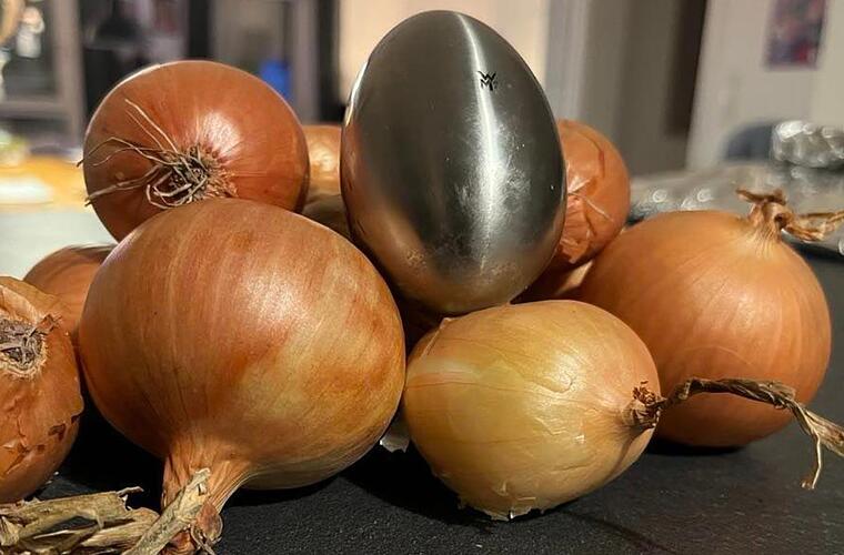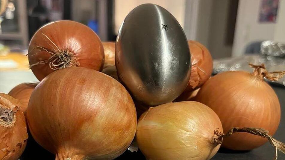 Jetzt sind wir auf etwas gestoßen, das angeblich helfen soll: Stahl-Seife*! Ein Stück Seife, das aus Metall besteht, nicht schäumt und keinen eigenen Geruch hat, soll den intensiven Geruch der Zwiebel überdecken? Das haben wir direkt ausprobiert!