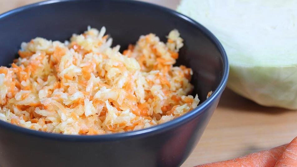 Salat vorbereiten: Während das Fleisch ruht, das Weißkraut und die Karotten fein hobeln und in eine große Schüssel geben. In einer kleineren Schüssel das Dressing aus Essig, Öl, Honig, Senf, Salz und Pfeffer anrühren. Das Dressing über das gehobelte Gemüse gießen und gut vermengen, damit der Salat durchziehen kann.