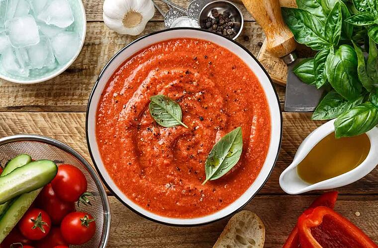 Viel frisches und regionales Gemüse, wenige Kohlenhydrate und richtig erfrischend: Die Gemüse-Gazpacho von Fernsehkoch Wolfgang Link ist ideal für heiße Tage. Kalt gegessen ist sie ein echter Genuss. Dazu empfehle ich dir ein leckeres Baguette.