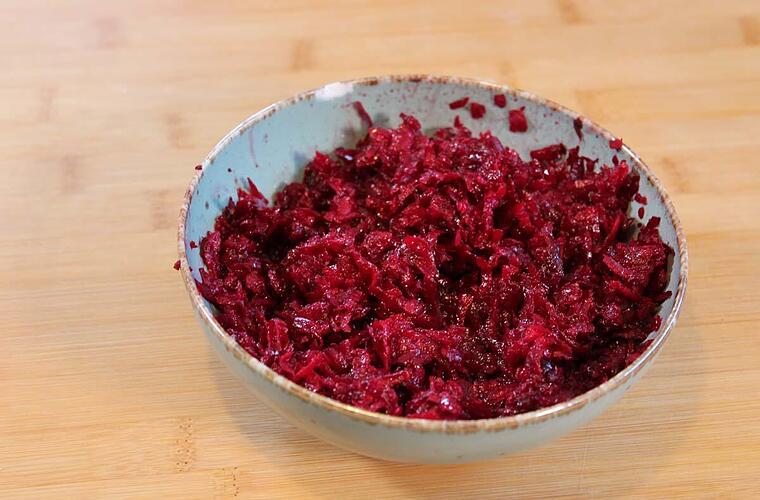 - Die Rote Bete schälen und mit einer feinen Reibe raspeln.