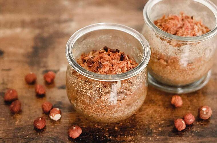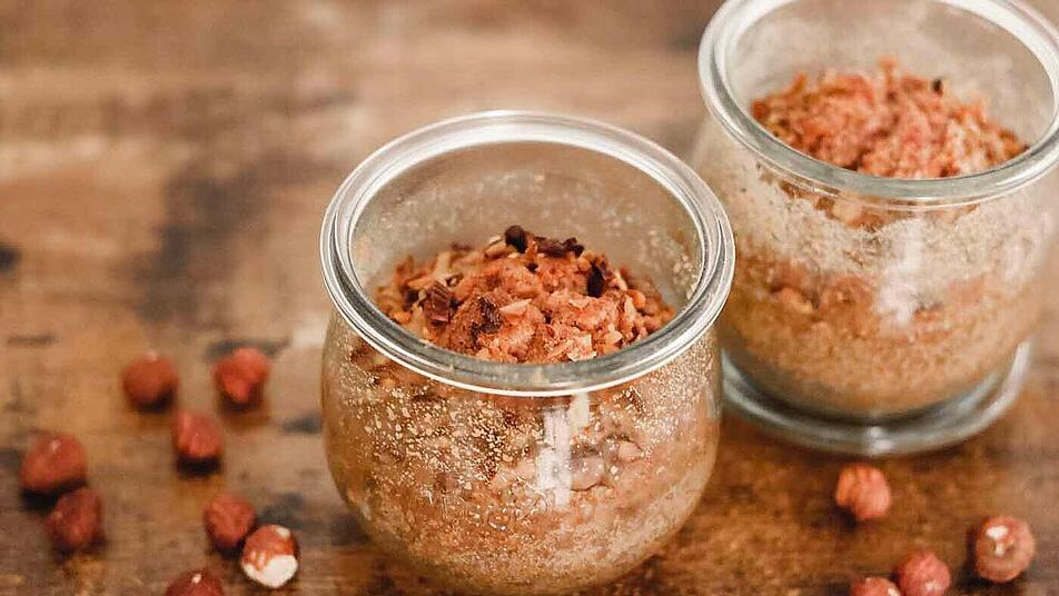 - Die Rote Beete schälen, fein reiben und mit 150 Gramm der gerösteten Nüsse unter den Teig heben. Den Teig in die vorbereiteten Gläser füllen und die übrigen Nüsse darüberstreuen.