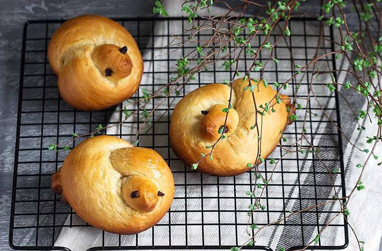 - Eigelb mit Kondensmilch verrühren und die Knoten damit bestreichen. Den Teig 10 Minuten ruhen lassen, damit sich eine glatte Oberfläche bildet.