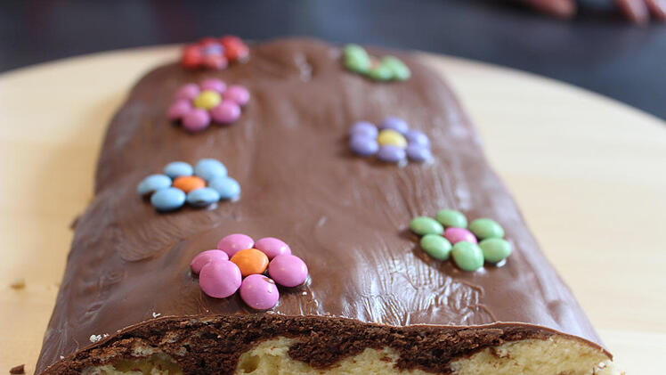Vollmilch Kuvertüre schmelzen und auf dem Kuchen verstreichen und anschließend je nach Geschmack verzieren.