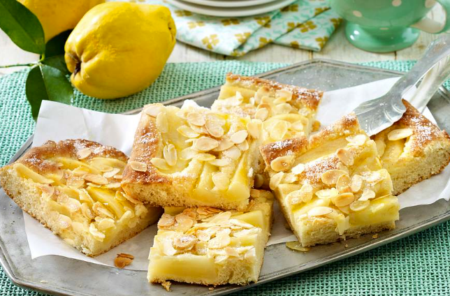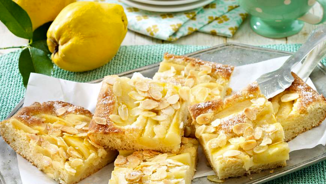 - Den Rührteig gleichmäßig auf das vorbereitete Backblech streichen. Die abgetropften Quittenspalten darauf verteilen und nach Wunsch mit Mandeln bestreuen.