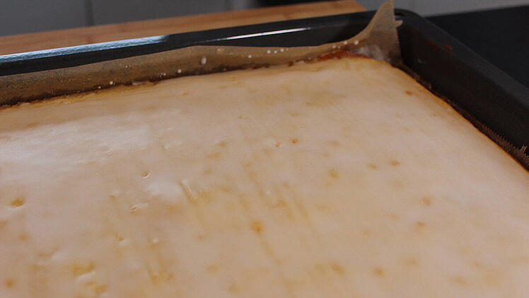 Den Rührteig auf ein mit Backpapier ausgelegtes Backblech geben und glatt streichen. Den Kuchen im vorgeheizten Backofen ca. 25 Minuten hellbraun backen.