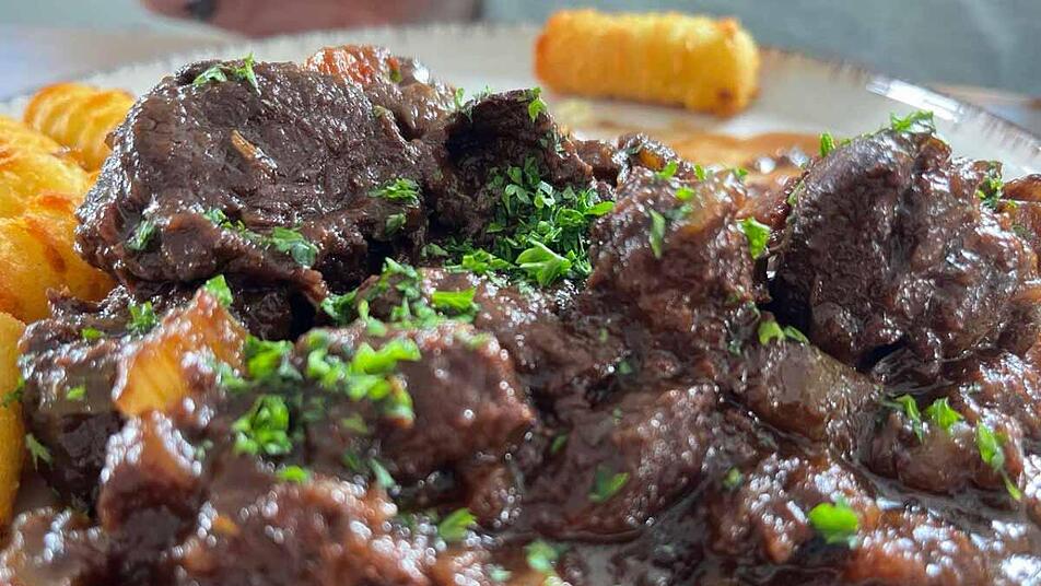 Ein besonderes Rezept: Hirschragout mit Rotwein-Soße, zubereitet mit fränkischem Wein. Wir nutzen die kräftigen Aromen des fränkischen Rotweins, um dem zarten Hirschfleisch eine unverwechselbare Note zu verleihen. Perfekt für ein gemütliches Abendessen oder besondere Anlässe! Gut dazu passen Nudeln, Kroketten oder Klöße.