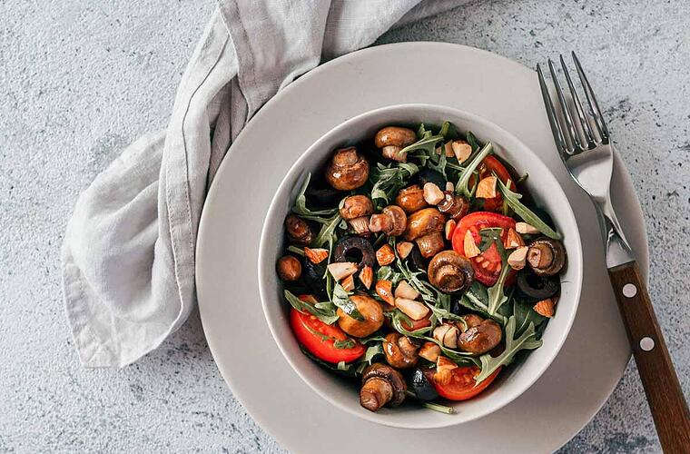 Ein feiner Rucola-Salat mit frischen Pilzen und Tomaten - so stellen wir uns das perfekte leichte Essen vor. Natürlich eignet sich der Salat auch gut als Beilage oder schnelles Mittagessen.