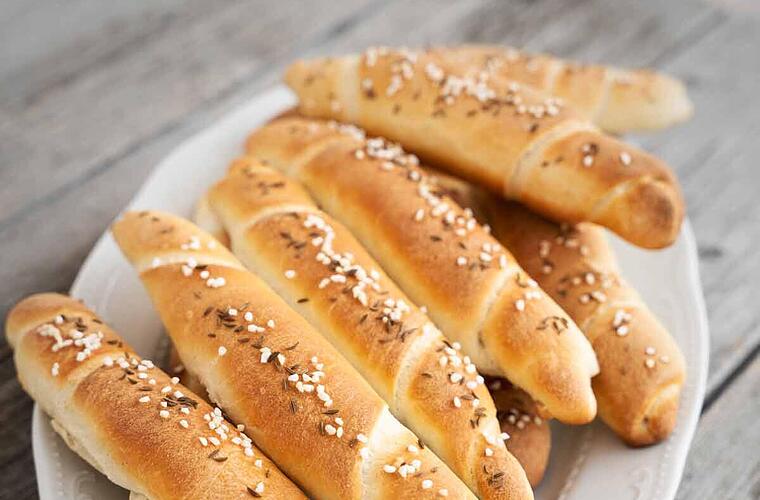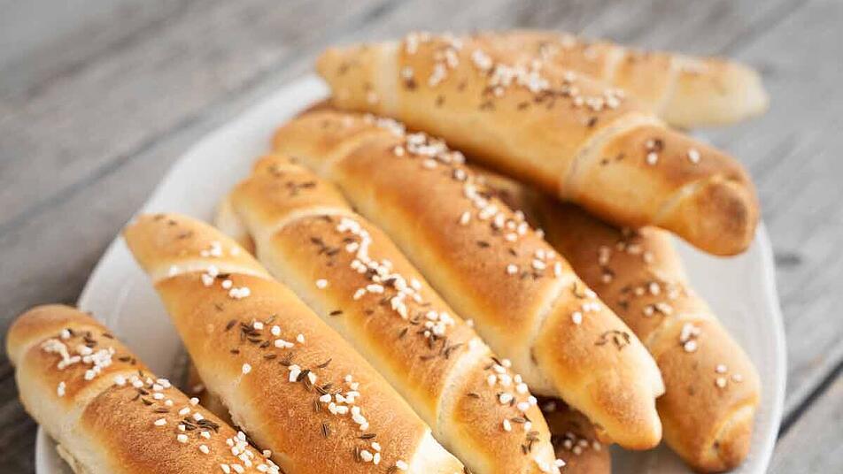- Die Stangen nach der Reifezeit etwas mit Wasser befeuchten, mit groben Salz und Kümmel bestreuen. und für etwa 25 Minuten goldbraun backen lassen.