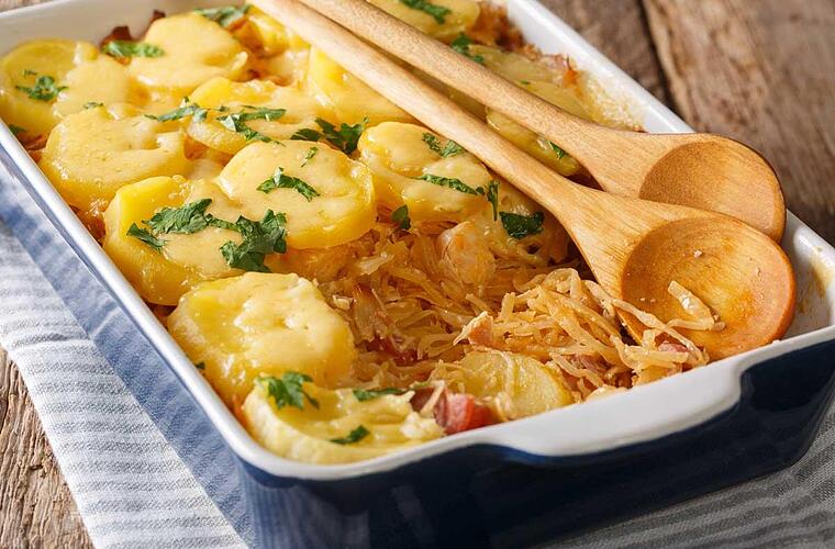 Kartoffeln und Sauerkraut gehören in der fränkischen Küche einfach dazu. Im Rezept für Sauerkraut-Kartoffel-Auflauf sind die beiden beliebten Zutaten sogar in Kombination vorhanden. Dadurch könnt ihr das Gericht sowohl als vollwertige Hauptspeise genießen, als auch als Beilage zu Wurst oder Fleisch. Viel Spaß beim Ausprobieren!