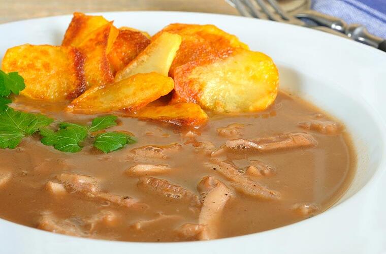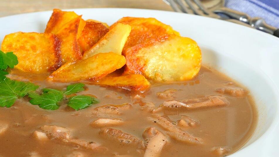 Saure Kutteln oder saure Fleck sind eine traditionelle badisch-schwäbische Spezialität, doch auch bei uns in Franken gelten die Kutteln als beliebtes Gericht. Was früher als Arme-Leute-Essen bekannt war, ist heute eine alte kulinarische Spezialität, die sich einer zunehmenden Beliebtheit erfreut. Am besten lassen sich die sauren Kutteln mit leckeren Bratkartoffeln oder eine frischen Scheibe Brot genießen!
