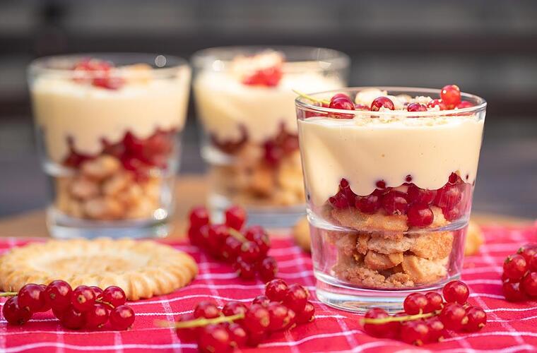 - Johannisbeeren waschen und abtrocknen, ein paar davon zum Garnieren beiseite legen.