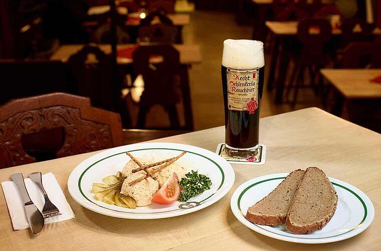 Zum Schlenkerla-Käse empfehlen wir ein Original Aecht Schlenkerla Rauchbier.