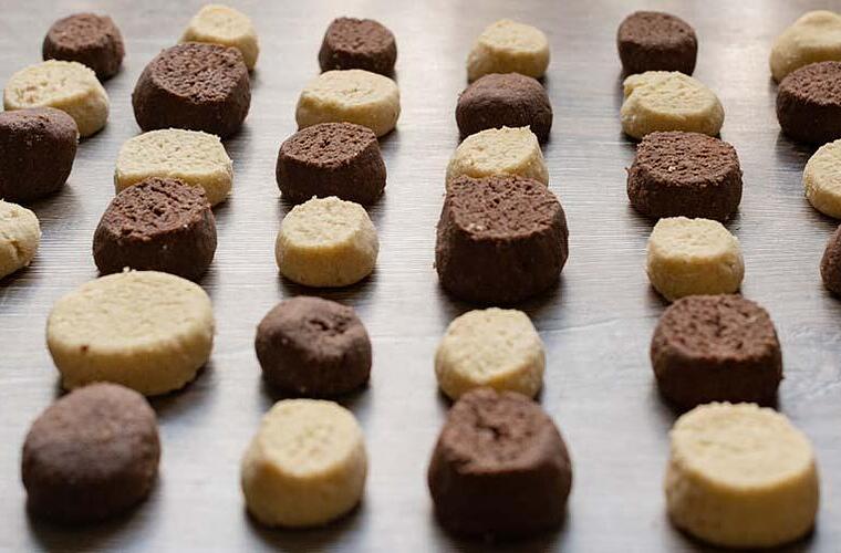 - Schmalz, Butter, Zucker und Vanillezucker in einer Schüssel cremig schlagen, bis die Masse schön schaumig ist. Mehl und Backpulver miteinander vermengen und unter den Teig kneten. Den Teig in zwei gleiche Portionen teilen. Eine Hälfte mit Kakao verkneten, sodass zwei unterschiedlich gefärbte Teige entstehen.