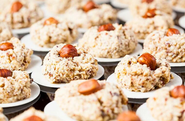 - Die abgekühlten Haselnussmakronen auf einem Teller anrichten oder in einer Keksdose aufbewahren.