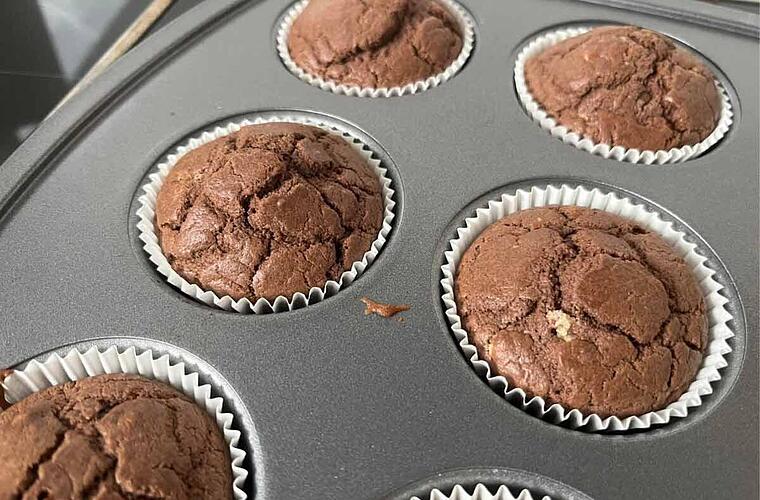 Mit einem Stäbchen testen, ob die Muffins schon durch sind. Und bei Bedarf noch ein paar Minuten weiter backen. Die Muffins dann aus dem Backofen nehmen und auskühlen lassen.
