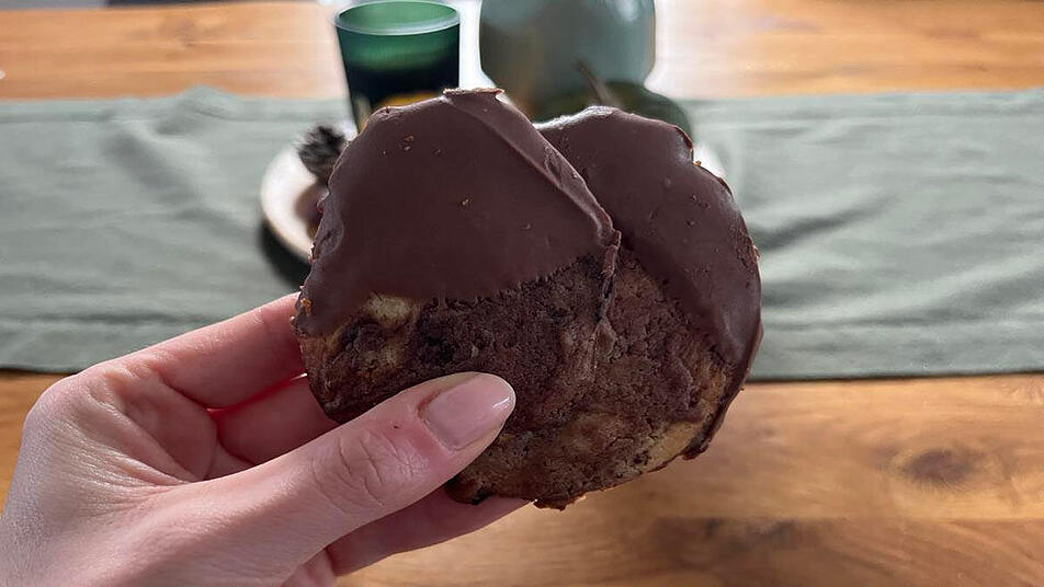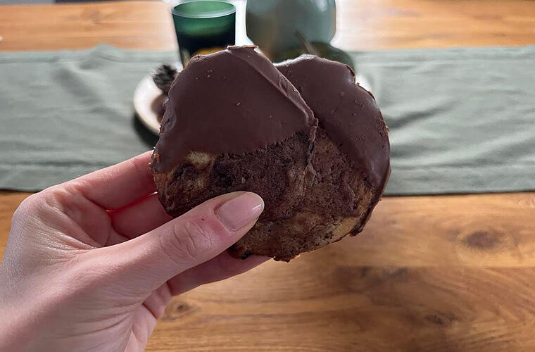 Auf einem Gitterrost vollständig auskühlen lassen und anschließend nach Belieben noch mit Schokoladenglasur verzieren. Wir haben Vollmilchglasur benutzt.
